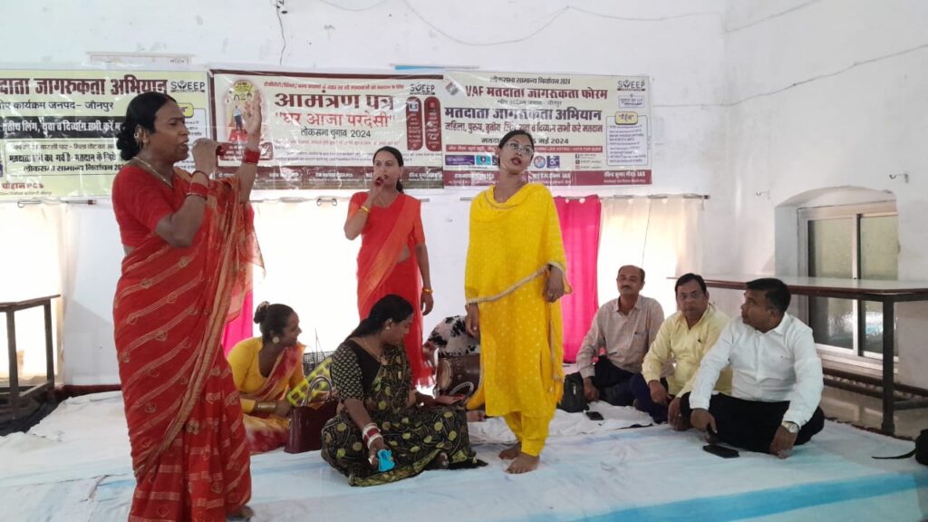 मतदान प्रतिशत बढ़ाने के लिए नई पहल थर्ड जेंडर के माध्यम से मतदाता जागरूकता ,थर्ड जेंडर ने गीत-घर आजा परदेसी, तेरा वोट बुलाए रे, सहित कई गीत गाकर मतदान हेतु किया प्रेरित