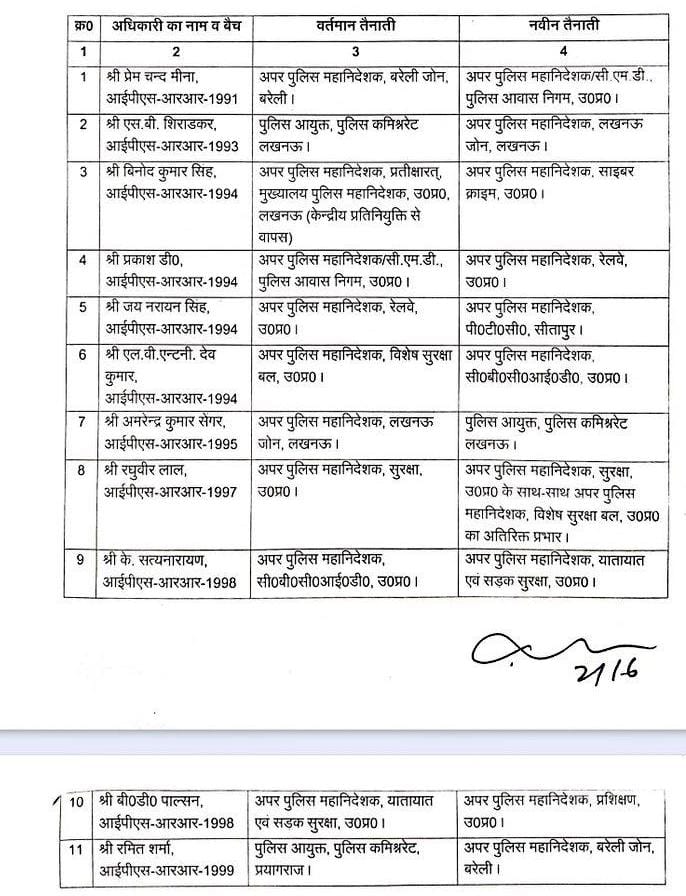 लखनऊ – लखनऊ के पुलिस कमिश्नर हटाए गए,प्रयागराज के पुलिस कमिश्नर भी हटाए गए,लखनऊ पुलिस कमिश्नर एसबी शिराडकर हटाए गए ,अमरेंद्र कुमार सेंगर लखनऊ के नए पुलिस कमिश्नर ,एसबी शिराडकर अपर पुलिस महानिदेशक लखनऊ जोन बने ,रमित शर्मा अपर पुलिस महानिदेशक बरेली जोन बनाए गए ,प्रेमचंद मीना एडीजी पुलिस आवास निगम लखनऊ बने ,विनोद कुमार सिंह एडीजी साइबर क्राइम यूपी बनाए गए ,प्रकाश डी अपर पुलिस महानिदेशक रेलवे बनाए गए ,जय नारायन सिंह एडीजी पीटीसी सीतापुर बनाए गए ,एलवी एंटनी देव एडीजी सीबीसीआईडी यूपी बनाए गए ,रघुवीर लाल को एडीजी सुरक्षा के साथ ADG एसएसएफ ,के सत्यनारायण अपर पुलिस महानिदेशक यातायात बने ,बीडी पॉल्सन अपर पुलिस महानिदेशक प्रशिक्षण बनाए गए.