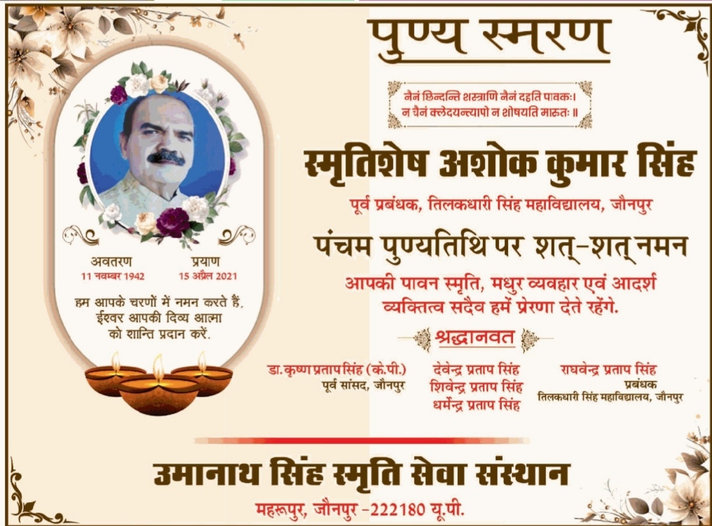 जौनपुर। तिलकधारी सिंह महाविद्यालय, जौनपुर के पूर्व प्रबंधक स्वर्गीय अशोक कुमार सिंह की पंचम पुण्यतिथि आज श्रद्धा एवं सम्मान के साथ मनाई जाएगी। इस अवसर पर आयोजित कार्यक्रम में परिजन, शुभचिंतक एवं क्षेत्रवासी एकत्र होकर उन्हें भावभीनी श्रद्धांजलि अर्पित करेंगे।