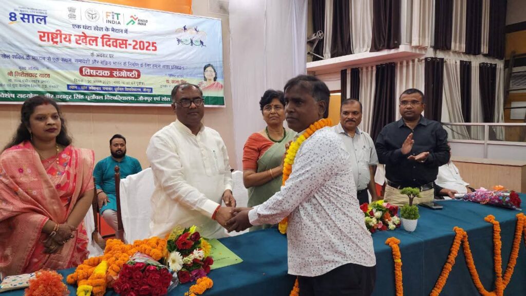 भारत सरकार की गाईडलाइन्स के अनुसार खेल दिवस के दूसरे दिन ’’खेल शक्ति के माध्यम से एक सक्षम, समावेषी और सक्रिय भारत निर्माण के लिए हमारी साझा प्रतिबद्धता’’ विषयक संगोष्ठी का आयोजन पूर्वांचल विश्वविद्यालय के महन्त अवैद्यनाथ सभागार में पूर्वान्ह 11.00 बजे से किया गया। उक्त संगोष्ठी के मुख्य अतिथि गिरीश चन्द्र यादव, राज्यमंत्री (स्वतंत्र प्रभार), खेल एवं युवा कल्याण विभाग उ0प्र0 सरकार एवं कार्यक्रम की विशिष्ट अतिथि प्रो0 वन्दना सिंह, कुलपति, वीर बहादुर सिंह पूर्वांचल विश्वविद्यालय उपस्थित थी। संगोष्ठी का संचालन डॉ0 राजेश सिंह, वरिष्ठ बास्केटबाल खिलाड़ी के द्वारा किया गया। संगोष्ठी में श्यामबाबू यादव,जिला पंचायत सदस्य, सुनील यादव ’’मम्मन’’, ब्लाक प्रमुख प्रतिनिधि करंजाकला, डॉ0 गोरखनाथ पटेल, जिला बेसिक शिक्षा अधिकारी, जौनपुर, जिला विद्यालय निरीक्षक, जौनपुर के अतिरिक्त विश्वविद्यालय कर्मचारी संघ के अध्यक्ष नन्द किशोर सिंह, श्री सुरेश सिंघानिया, भाजपा जिला उपाध्यक्ष, श्री प्रशान्त रंजन ’’दीपक’’ मण्डल अध्यक्ष करंजाकला, श्रीमती सारिका सोनी, मण्डल अध्यक्ष शहर उत्तरी, पूर्व मण्डल अध्यक्ष श्री राजकेशर पाल के अलावा कई अन्य गणमान्य व्यक्ति उपस्थित थे।