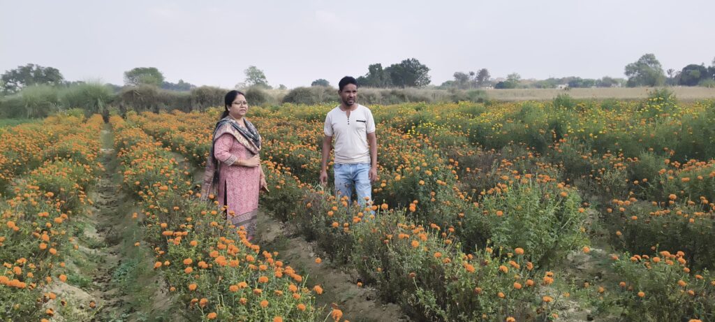 प्रगतिशील कृषक सद्दाम हुसैन द्वारा लगभग 1.2 हे0 में गेंदा की खेती की गयी है जिसकी सिचाई स्प्रिंकलर पद्धति द्वारा कर रहे है जिससे सिचाई पर कम खर्च आता है और पानी की बचत भी होती है। फसल भी हरी भरी एवं स्वस्थ रहती है जिससे गेंदा के फूलो का उत्पाद भी दुगना होता है और फूलो की माला बनाकर मंडी में बेचा जाता है जिससे अच्छा मुनाफा मिलता है जिससे किसान को सालाना कम से कम 2 लाख से 4.5 लाख रु का मुनाफा होता है और अन्य कृषको के लिए भी प्रेरणा का स्रोत बन रहे है।