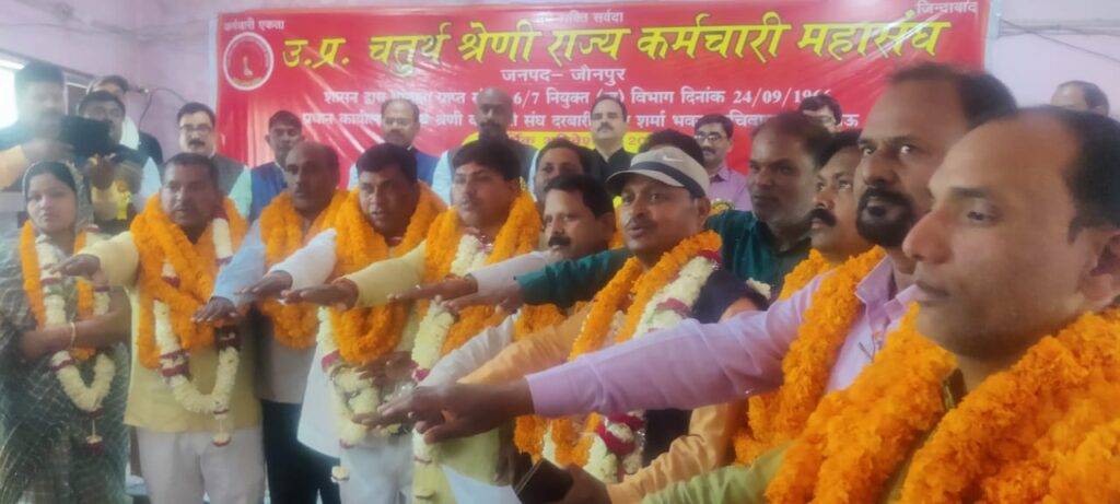 उत्तर प्रदेश चतुर्थ श्रेणी राज्य कर्मचारी महासंघ के ऐतिहासिक अधिवेशन /चुनाव में जनपद के विभिन्न विभागों के चतुर्थ श्रेणी एवं विकासखंडों के कर्मचारियों ने सर्वसम्मति से लगातार दूसरी बार अजय कुमार सिंह को अध्यक्ष, सभाजीत यादव को मंत्री, अजय लाल मौर्या को कोषाध्यक्ष, राम पूजन यादव को संप्रेक्षक तथा सुभाष गुप्ता संगठन को मंत्री पद हेतु चयनित किया। उपस्थित सदन ने वरिष्ठ उपाध्यक्ष केसरी प्रसाद व प्रेमलाल गौतम और उपाध्यक्ष के पद पर कुलदीप यादव, दिनेश यादव, चंद्र प्रकाश यादव, अखिलेश कुमार नाविक, कुलदीप कुमार, बबलू श्रीवास्तव, संयुक्त मंत्री के पद पर अजय राजभर, अनिल कुमार सोनकर, मीडिया प्रभारी प्रमोद कुमार शर्मा , प्रचार मंत्री राजनाथ, महेंद्र पाल, नीतीश को निर्विरोध चयनित किया l महिला प्रकोष्ठ में मधुबाला मौर्य अध्यक्ष महिला मोर्चा प्रमिला सिंह मंत्री निर्विरोध निर्वाचित हुयी l सफाई कर्मचारी संघ के पूर्व जिला अध्यक्ष सरताज सिंह को चतुर्थ श्रेणी राज्य कर्मचारी महासंघ जौनपुर का संरक्षक मनोनीत किया गया।चयनित कमेटी को कार्यक्रम के विशिष्ट अतिथि डॉ अतुल प्रकाश यादव अध्यक्ष पूर्व माध्यमिक शिक्षक संघ जौनपुर के द्वारा पद एवं गोपनीयता की शपथ दिलाई गयी l