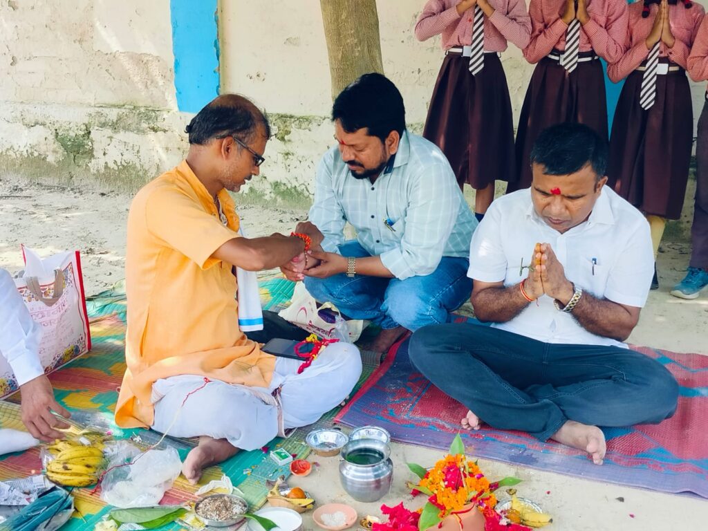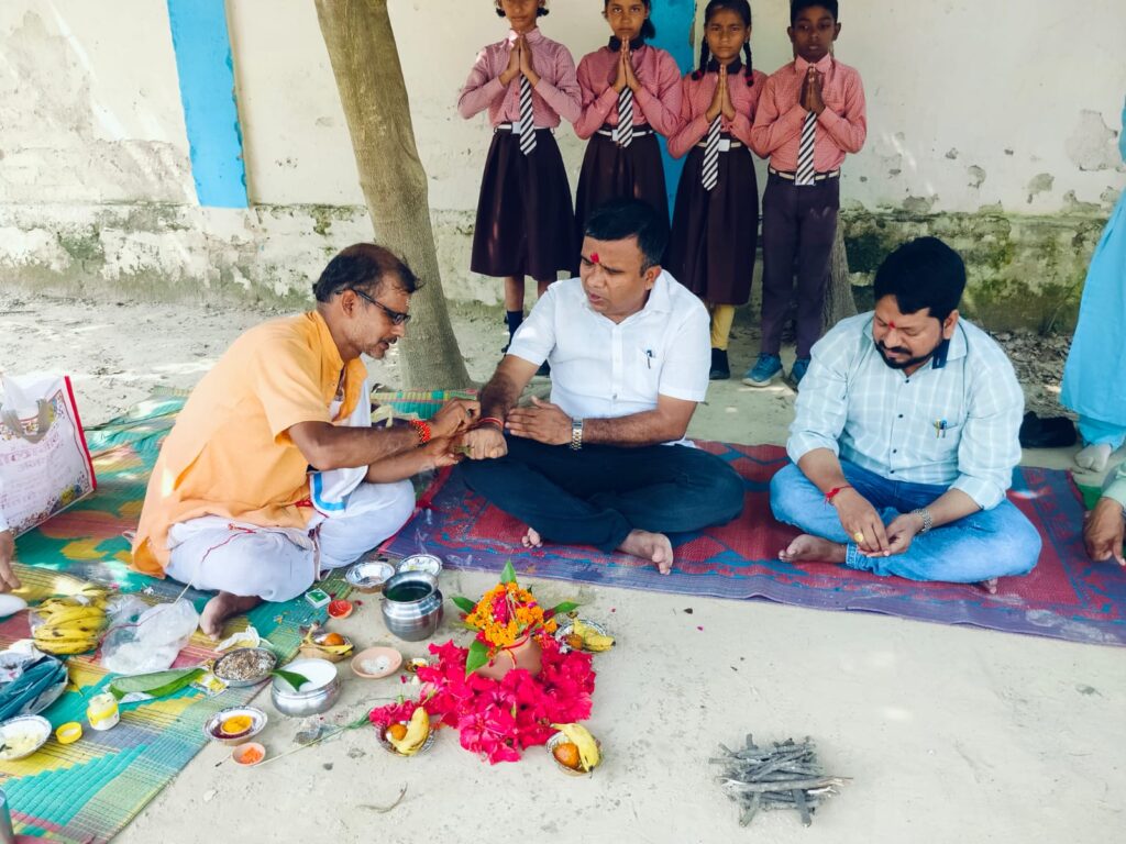 समस्त विद्यालय परिवार की उपस्थिति मे भूमि पूजन संपन्न हुआ।बताते चलें कि विद्यालय मे कुल 4 कक्षा कक्ष है एवं एक कक्षा के बच्चे विपरित मौसम मे भी बरामदे मे बैठकर पढ़ने को मजबूर थे।विद्यालय परिवार के सहयोग एवं जिला बेसिक शिक्षा अधिकारी एवं खंड शिक्षा अधिकारी के मार्गदर्शन मे सहायक अध्यापिका प्रतिमा मिश्रा ने नया कक्षा बनवाने का संकल्प लिया।जिसमें जन समुदाय,जन प्रतिनिधियों एवं उच्च वर्ग के लोगों से मदद की मांग की।