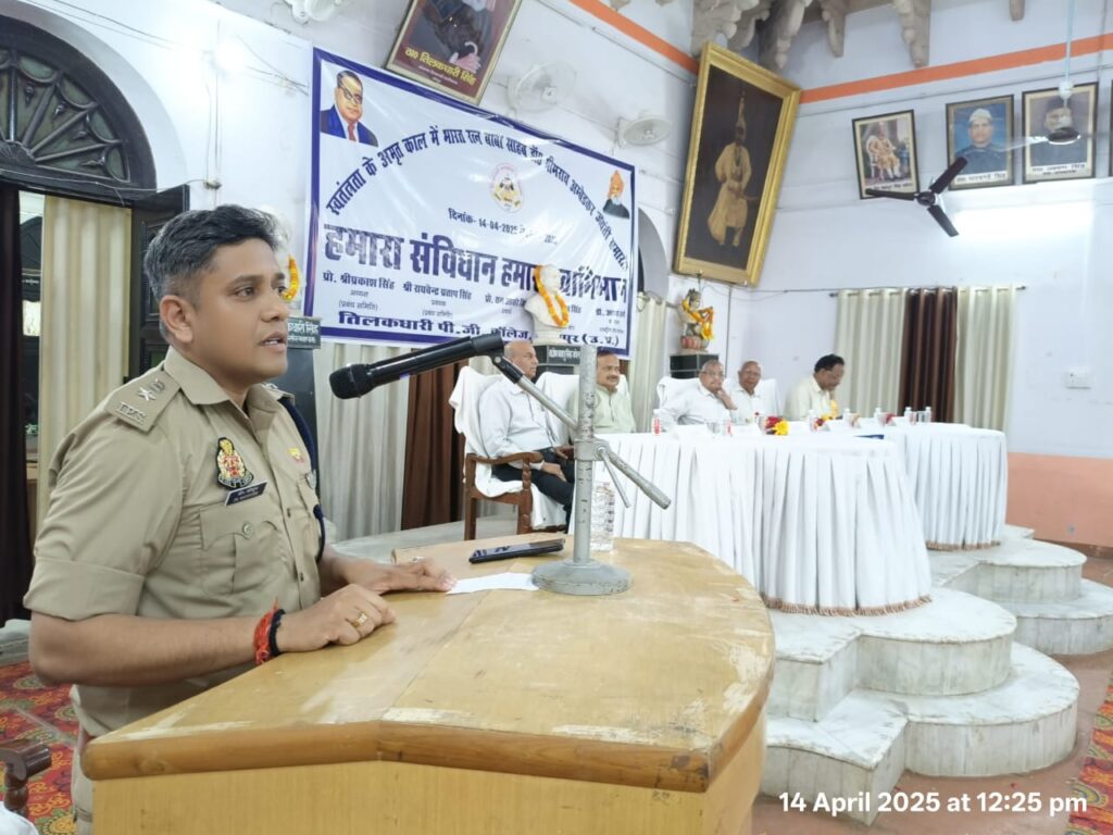 प्रशस्त पुण्य पंथ है, बढे चलो-बढे चलो। उन्होंने कहा कि जौनपुर की पानी और मिट्टी में इंटेलिजेंस है और यहां के लोगों में दृढ़निश्चय भी होता है जो ठान लेते हैं उसको निश्चित रूप से पूरा करते हैं। उन्होंने बच्चों से मोबाइल का सदुपयोग करने तथा व्हाट्सएप ग्रुप के माध्यम से हो रहे अपराधों के बारे में सजग किया। उन्होंने कहा कि आप ट्रैफिक के नियमों का अनुपालन कीजिए तथा फालतू के प्रेम प्रसंग में पड़कर अपने माता-पिता,समाज का सम्मान एवं अपना जीवन बर्बाद मत कीजिए। अंत में उन्होंने एक प्रेरक कविता द्वारा बच्चों का मनोबल बढ़ाया ‘तुम हमारी चोटियों की बर्फ को यूं मत कुरेदो, दहकता लावा हृदय में है कि हम ज्वालामुखी हैं। कार्यक्रम की अध्यक्षता कर रहे तिलकधारी स्नातकोत्तर महाविद्यालय प्रबंधन समिति के अध्यक्ष प्रोफेसर श्री प्रकाश सिंह जी ने कहा कि डॉक्टर भीमराव रामजी आंबेडकर विलक्षण प्रतिभा के धनी थे। ब्रिटिश काल में ही उन्होंने मूल कर्तव्यों एवं मूल अधिकारों के बारे में सोचा।सन 1938 में उनके पास 8000 पुस्तकों का संग्रह था। उन्होंने अमेरिका तथा इंग्लैंड से पढ़ाई करके अनेक डिग्रियां ली थी। उन्होंने समाज के दबेकुचले, निम्न स्तर के लोगों के जीवन स्तर को उठाने का सार्थक प्रयास किया। वे हिंदू कोड बिल जिसमें महिलाओं के पूर्ण अधिकार और पुरुषों के समान अधिकारों की बात की गई थी, के प्रबल समर्थक थे। ऐसी पुण्य आत्मा धरती पर कभी-कभी जन्म लेती है जो पूरे समाज के उत्थान के लिए ऐसा कर जाते हैं जिसे भुलाया नहीं जा सकता है। उन्होंने बच्चों से अनुशासित रहने, समय निश्चित करने, मोबाइल के सदुपयोग करने तथा पढ़ लिख कर समाज,जनपद तथा देश के लिए अपना योगदान देने का आवाहन किया। कार्यक्रम में बोलते हुए महाविद्यालय के प्राचार्य प्रोफेसर रामआसरे सिंह सर ने कहा कि डॉ० भीमराव अंबेडकर समाजसेवी,अर्थ शास्त्री, विधिवेत्ता तथा दलितों के मसीहा थे। उन्होंने कहा कि डॉक्टर अंबेडकर का नारा be educated, be organised be agitated समाज और देश के उत्थान के लिए बहुत महत्वपूर्ण था। उन्होंने कहा कि शिक्षा उनका सबसे बड़ा हथियार था। उन्होंने बच्चों को संबोधित करते हुए कहा कि किसी संस्था के आप दर्पण हैं,संस्कार आप अपने परिवार से लेकर आते हैं। 6 घंटे आप हमारे साथ जुड़े रहते हैं परंतु 18 घंटे आप अपने परिवार और समाज के साथ रहते हैं।गुरु शिक्षा देता है अगर आप संस्कार विहीन हैं तो ऐसी शिक्षा का कोई मतलब नहीं रह जाता है। किसी भी व्यक्ति की योग्यता का परिकलन उसकी शिक्षा से कीजिए न कि उसकी जाति से। आप सभी एक है न कि उच्च या निम्न। आप में स्पर्धा रहना चाहिए,ईर्ष्या नहीं। एक दूसरे का सम्मान कीजिए और पढ़-लिखकर महाविद्यालय,अपने माता-पिता तथा देश का नाम बुलंद कीजिए। कार्यक्रम 