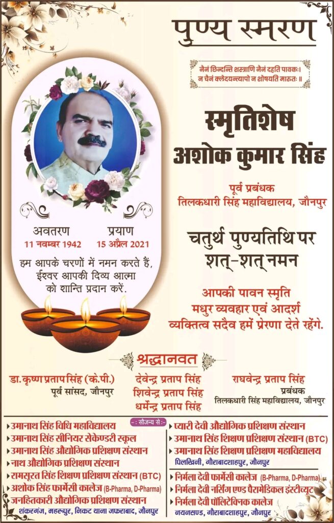 जौनपुर — जनपद जौनपुर के पूर्व भाजपा जिलाध्यक्ष व शहर के प्रतिष्ठित महाविद्यालय टीडीपीजी कॉलेज के प्रबंधक रहे स्मृति शेष ठाकुर अशोक कुमार सिंह की चौथी पुण्यतिथि आज 15 अप्रैल को मंगलवार को उनके पैतृक गांव महरुपुर शंकरगंज स्थित उमानाथ सिंह हायर सेकेंडरी स्कूल पर मनाई जाएगी. I.