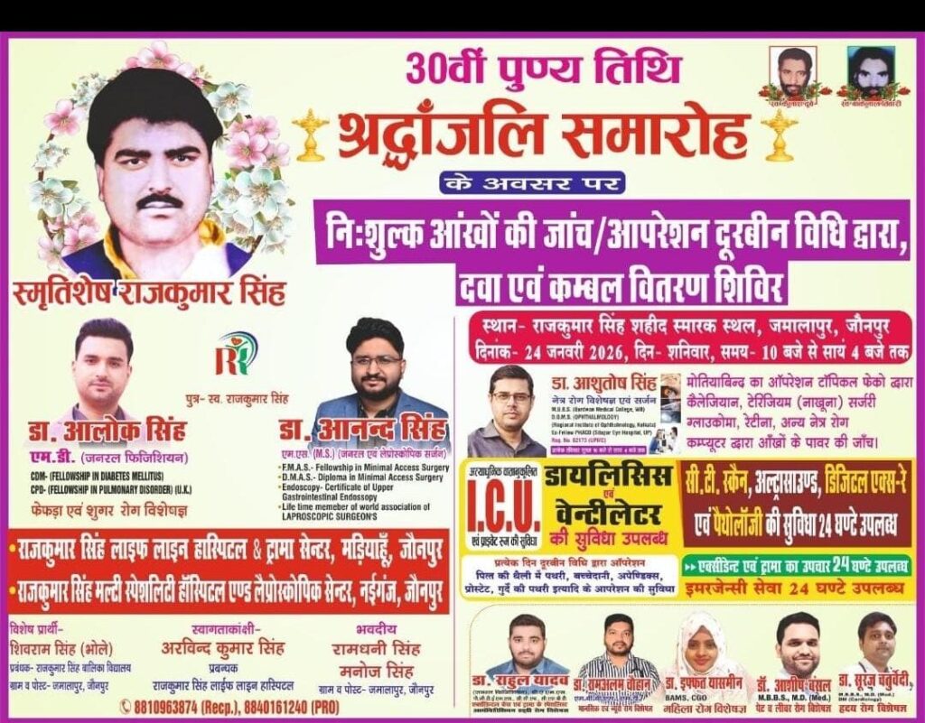 आपको बता दे की टीडी कॉलेज जौनपुर के पूर्व छात्र संघ अध्यक्ष एवं पूर्व जिला पंचायत सदस्य राजकुमार सिंह मड़ियाहूं तहसील के जमालापुर ग्राम सभा के निवासी थे। उनका जन्म 19 जनवरी 1966 को जमालापुर ग्राम सभा के पट्टी पूरवें में हुआ था। उनके पिता ठाकुर रामधनी सिंह एक्सरे टेक्निशियन थे। स्वर्गीय राजकुमार सिंह की प्रारंभिक शिक्षा दीक्षा जमालापुर ग्राम सभा से शुरू हुआ था जिसके कारण उन्होंने गांव की गरीबी बहुत करीब से देखा था। बचपन में ही पिता और बड़े पिता की सहयोग भावना को देखते हुए उनके अंदर गरीबों मजलूमों की सेवा करने की जज्बा जागी। इसी जज्बा ने उनको टीडीपीजी कॉलेज का छात्र संघ अध्यक्ष बनने पर मजबूर कर दिया। अध्यक्ष बनने के बाद अपने दिल में सहयोग की भावना सजोएं हुए लोगों की छोटी-मोटी सेवाएं करने लगे। इसी सेवा भाव ने उन्हें 1995 में जिला पंचायत सदस्य पद तक को सुशोभित कराया।स्व. राजकुमार सिंह के विषय में स्मरण बताता है कि जब भी कोई जरूरतमंद उनके पास जाता था उनके लिए वह अपना पूरा न्योछावर करने के लिए तैयार रहते थे इसके लिए कई बार उन्हें पुलिस थाने में भी बैठना पड़ा। छात्र संघ अध्यक्ष बनने के बाद जिले के लोग टीडी पीजी कॉलेज में प्रवेश पाने के लिए भी उनका सहयोग लेते थे। बताते हैं कि जो भी छात्र हो अथवा अभिभावक कभी उनके पास से निराश होकर नहीं लौटा, उनकी जयंती पर उनके भ्रातागण मनोज सिंह और अरविंद सिंह हमेशा लोगों की सहायता करना नहीं भूलते हैं। अपने छोटे भाई की सेवा भाव की कारवां को आगे बढ़ाने के लिए बड़े भ्राता बिजनेसमैन शिवराम सिंह “भोले” भी उनकी याद में लगातार सेवा करने का काम कर रहे हैं। भोले सिंह ने स्व. राजकुमार की याद में जमालापुर बाजार में राजकुमार सिंह बालिका विद्यालय चला रहे हैं और राजकुमार सिंह मेमोरियल हॉस्पिटल शहीद स्मारक के बगल में निर्माणाधीन है। वही राजकुमार सिंह के दो सपूत डॉ आलोक सिंह और डॉ आनंद सिंह। जो बेंगलुरु और अमेरिका से डॉक्टरी का पढ़ाई कर अपने स्वर्गीय पिता राजकुमार के पद चिन्हों पर चलते हुए उनके बनाएं मड़ियाहूं नगर स्थित अस्पताल पर जो रूग्णावस्था में पहुंचते हैं ऐसे गरीबों एवं मजलूमों की सेवा करने में अपना जान लगा देते हैं। दोनों सपूत रोग ग्रस्त मरीज पर पैसों का कोई महत्व नहीं देते हैं गरीबों का इलाज मुफ्त करने में कोई संकोच नहीं करते हैं।