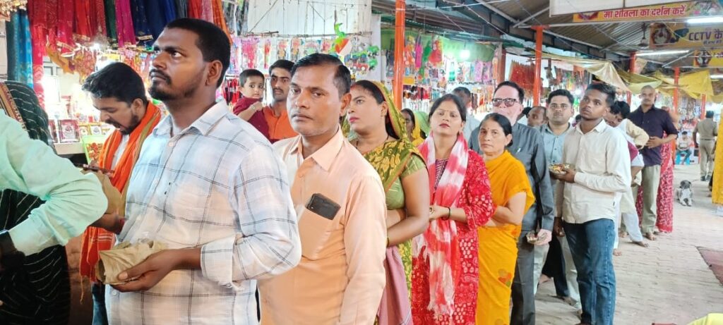 जौनपुर। सिद्धपीठ मां शीतला चौकियां धाम में शारदीय नवरात्रि के प्रथम दिन सुबह 4 बजे धाम के महंत विवेकानंद पण्डा ने माता रानी की आरती करके नवरात्रि का शुभारम्भ किया। इस मौके पर सभी भक्तों की लंबी कतारें लगी रहीं। चारों तरफ पुलिस और पीएसी लगी रही। पार्किंग की भी सुविधा की गई है। कोई मां का पचरा गा रहा है तो कोई कतार में खडे होकर मां की आरती कर रहा है। मां शीतला चौकिया महारानी की जयजयकार से गूंज उठा। चौकियां धाम पुलिस चौकी प्रभारी ईशचन्द्र यादव मयफोर्स निगरानी करते नजर आये। जगह-जगह सीसी कैमरे भी लगा दिये गये हैं। पंडा परिवार की तरफ से सत्य नारायण भगवान के पुजारी गुड्डू तिवारी ने विष्णु भगवान की आरती करके प्रथम दिन का शुरूआत किया। इस अवसर पर महंथ विवेकानंद पण्डा, अध्यक्ष विकास पण्डा, प्रबंधक सौरभ पण्डा, अजय पण्डा, विजय पण्डा, लाडू पण्डा, सोनू पण्डा सहित पूरा मंदिर परिवार उपस्थित रहा।