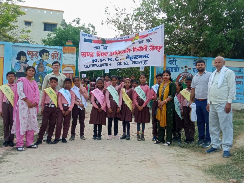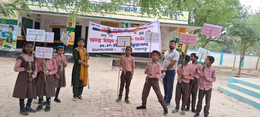 टीम ने प्रजापति बस्ती के मैदान में विद्यालय गयासपुर के बच्चों एवं उनके अभिभावकों के बीच ‘नुक्कड़ नाटक’ के माध्यम से प्रेरित करते हुए बताया कि सभी अभिभावक अपने बच्चों को प्रतिदिन विद्यालय भेंजे l स्कूल के दिनों में बच्चों से ऐसा कोई कार्य न कराएं जिससे की उनकी शिक्षा बाधित हो।