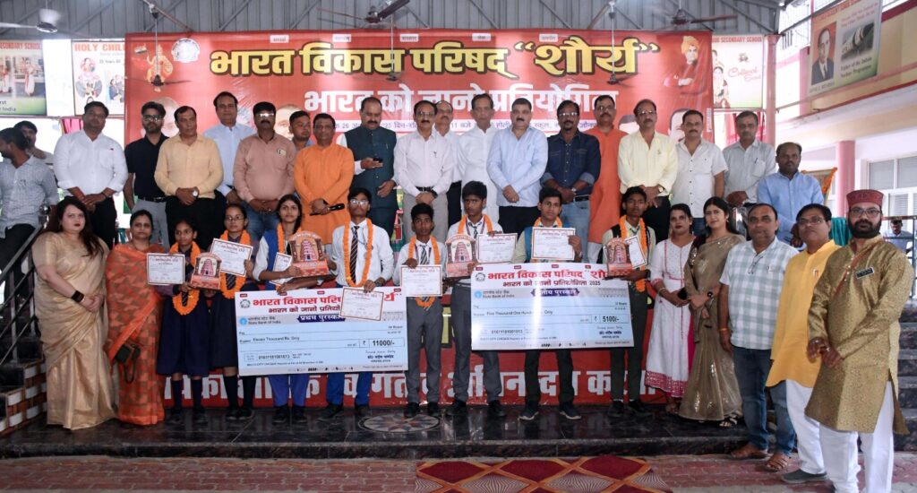 जौनपुर। भारत विकास परिषद शौर्य के संस्थापक अध्यक्ष डॉ. संदीप पाण्डेय के नेतृत्व में ‘भारत को जानो’ प्रतियोगिता का आयोजन शहर के प्रतिष्ठित विद्यालय होली चाइल्ड एकेडमी में किया गया। इस कार्यक्रम का शुभारंभ सर्वप्रथम विशिष्ठ अतिथि के रूप में उपस्थित जिला बेसिक शिक्षा अधिकारी जौनपुर डॉ. गोरखनाथ पटेल एवं संस्थान के प्रबंधक डॉ. अशोक सिंह के हाथों भारत माता एवं स्वामी विवेकानंद के चित्र पर पुर्ष्पापण एवं दीप प्रज्वलन के द्वारा किया गया। पूर्व महिला संयोजिका ज्योति श्रीवास्तव द्वारा वंदेमातरम गीत गाया गया। इस कार्यक्रम में सम्पूर्ण प्रतियोगिता का आयोजन प्रकल्प प्रमुख नित्यानंद पाण्डेय के नेतृत्व में किया गया जिसमें सर्वप्रथम जनपद के 28 विद्यालयों के कुल 5800 छात्रों में से चयनित 237 छात्रों की लिखित परीक्षा ली गई और जिसमें वरिष्ठ बच्चों में 20 छात्रा और कनिष्ठ वर्ग के बच्चों में 18 छात्र का चयन मंचीय कार्यक्रम में क्विज परीक्षा के लिए किया गया।