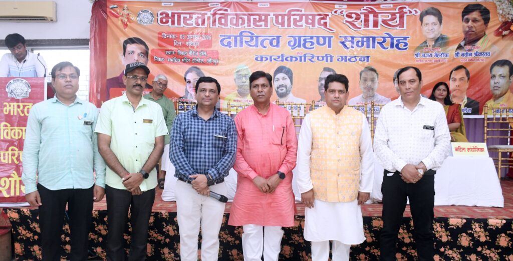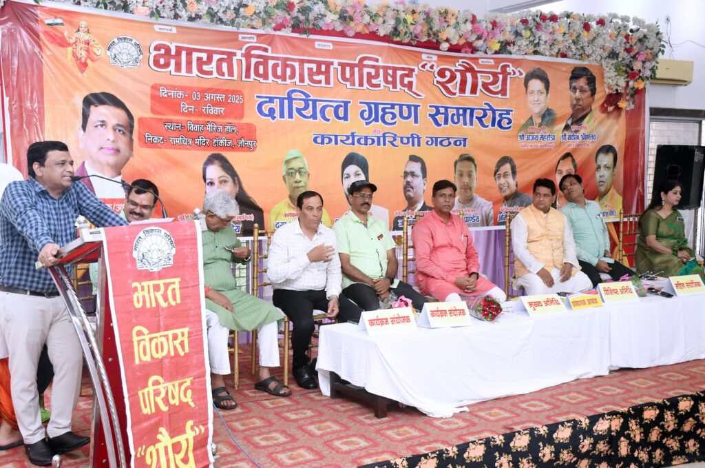 जौनपुर। भारत विकास परिषद शौर्य के संस्थापक डा. संदीप पाण्डेय के नेतृत्व में शहर के प्रतिष्ठित सभागार में एक कार्यक्रम आयोजित किया गया जिसमें संगठन के वर्ष 2025—26 के लिये नई कार्यकारिणी का गठन ​हुआ और दायित्वधारियों ने अपने कार्य के प्रति शपथ ली। सर्वप्रथम कार्यक्रम का प्रारम्भ भारत माता एवं स्वामी विवेकानन्द के चित्र पर पुष्प अर्पण एवं दीप प्रज्ज्वलन करके किया गया। ज्योति श्रीवास्तव ने वन्दे मातरम गीता गाया एवं विष्णु प्रिया मिश्र ने गणेश वन्दना पर नृत्य प्रस्तुत किया। कार्यक्रम के विशिष्ट अतिथि काशी प्रान्त के प्रान्तीय अध्यक्ष अजीत मेहरोत्रा द्वारा इस नवीन कार्यकारिणी में अध्यक्ष डा. सन्दीप पाण्डेय, सचिव अवधेश गिरी, कोषाध्यक्ष जनार्दन पाण्डेय को शपथ दिलाई गई।