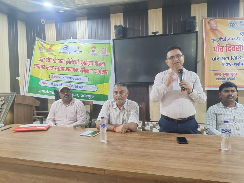 जौनपुर – कृषि विभाग द्वारा शुक्रवार को विकास खण्ड शाहगंज स्थित बी0आर0सी0 सभागार में उत्तर प्रदेश मीलेट्स पुनरोद्धार योजना अन्तर्गत स्कूल अध्यापकों का प्रशिक्षण कार्यक्रम आयोजित किया गया जिसमें श्री अन्न के महत्व एवं उपयोगिता से अध्यापकों को प्रशिक्षित किया गया।