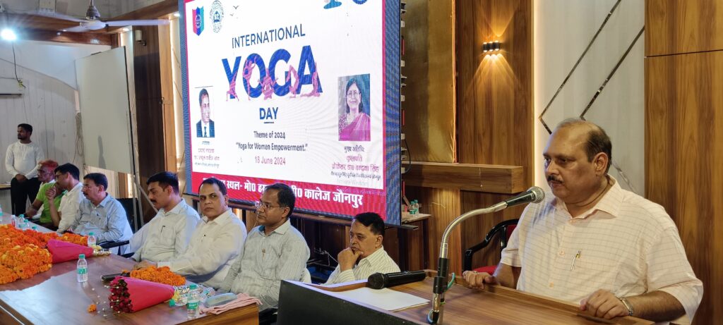 जौनपुर -शहर के मोहम्मद हसन पीजी कॉलेज के सौदागर हाल में अंतर्राष्ट्रीय योग दिवस के मिशन के तहत कार्यक्रम का आयोजन किया गया, कार्यक्रम की अध्यक्षता प्राचार्य डॉ0 अब्दुल कादिर खान ने की एवं मुख्य अतिथि वित्त अधिकारी डॉ0 संजय राय पूर्वांचल विश्वविद्यालय एवंम परीक्षा नियंत्रक अजीत प्रताप सिंह पूर्वांचल विश्वविद्यालय रहे।