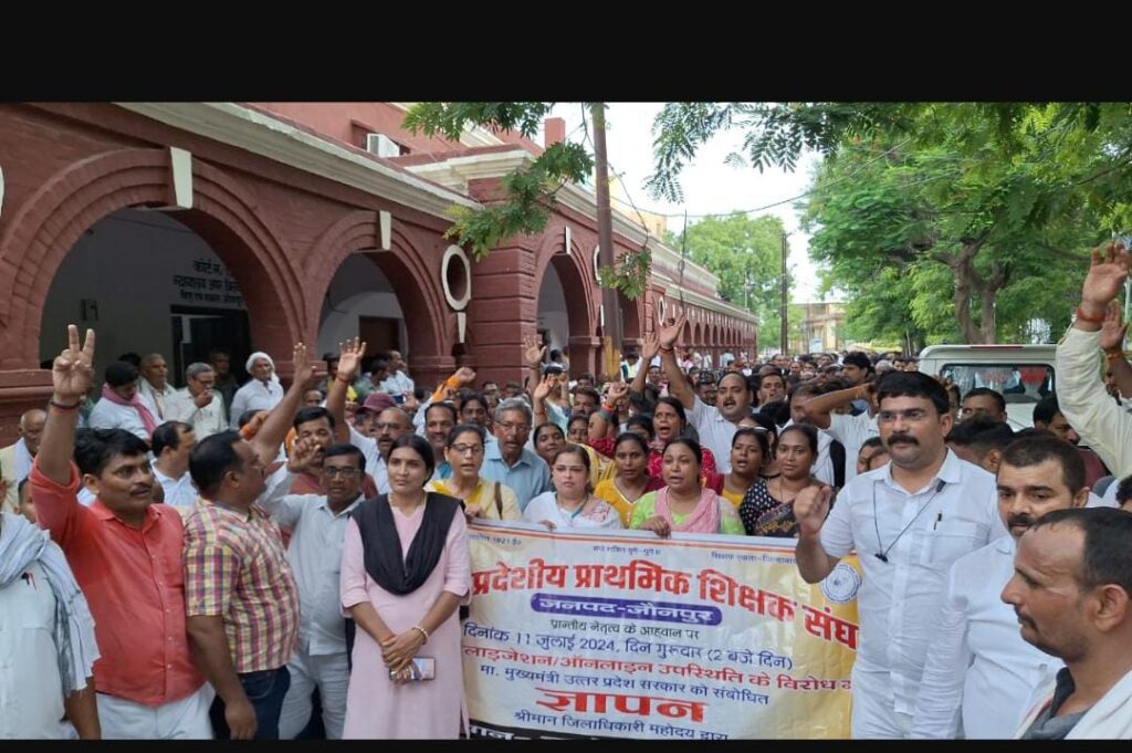 बेसिक शिक्षा परिषद विभाग द्वारा आठ जुलाई से शिक्षकों के डिजिटल उपस्थिति एंव डिजिटल पंजिका का आदेश हुआ है। उक्त आदेश का उत्तर प्रदेशीय प्राथमिक शिक्षक संघ विरोध करते हुए आंदोलन कर रहा है। इसी क्रम में उत्तर प्रदेशीय प्राथमिक शिक्षक संघ के जिलाध्यक्ष अमित सिंह एवं जिला मंत्री सतीश पाठक के नेतृत्व में हजारों पुरुष व महिला शिक्षक दिन में लगभग तीन बजे कलेक्ट्रेट परिसर में एकत्रित होकर डिजिटल उपस्थिति के विरोध में प्रदर्शन कर जिला प्रशासन के माध्यम से प्रदेश के मुख्यमंत्री को ज्ञापन दिया।