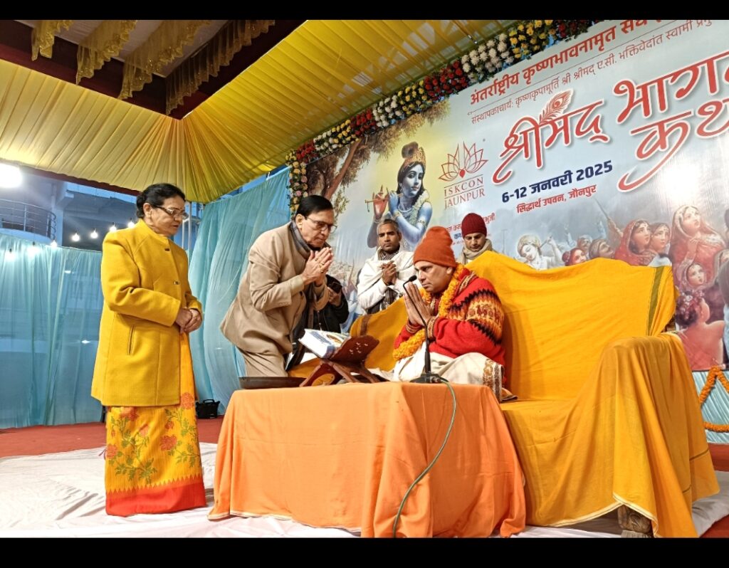 जौनपुर। अंतर्राष्ट्रीय कृष्ण भावनामृत संघ (इस्कॉन) जौनपुर द्वारा सिद्धार्थ उपवन में आयोजित श्रीमद् भागवत कथा के दूसरे दिन भक्ति और आध्यात्मिकता से परिपूर्ण वातावरण देखने को मिला। भव्य संकीर्तन यात्रा के बाद कथा व्यास कमल लोचन प्रभु जी (अध्यक्ष, इस्कॉन मीरा रोड—मुंबई एवं वापी—गुजरात) ने भगवान श्रीकृष्ण की दिव्य लीलाओं और भक्तियोग के महत्व पर प्रकाश डाला।
