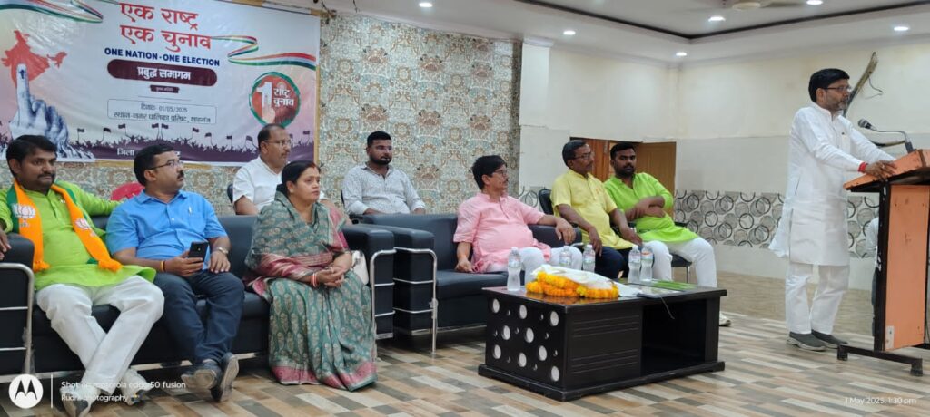 जिलाध्यक्ष पुष्पराज सिंह ने कहा कि भारत में, राज्य विधानसभाओं और संसद के सदस्यों के चुनाव के लिए आम चुनाव अलग-अलग आयोजित किए जाते हैं, जब मौजूदा सरकार का कार्यकाल समाप्त हो जाता है या किसी कारण से भंग हो जाती है। भारत में 1951-52 से 1967 तक राज्य विधानसभाओं और लोक सभा के लिए चुनाव एक साथ होते थे। यह चक्र टूट गया और वर्तमान में चुनाव हर वर्ष और कभी-कभी एक वर्ष के भीतर अलग-अलग समय पर होते हैं, जिसके परिणामस्वरूप भारी सरकारी व्यय होता है, चुनावों में लगे सुरक्षा बलों और निर्वाचन अधिकारियों को लंबे समय तक अपने प्राथमिक कर्तव्यों से विमुख होना पड़ता है, आदर्श आचार संहिता लागू होने के कारण विकास कार्यों में बाधा उत्पन्न होती है।