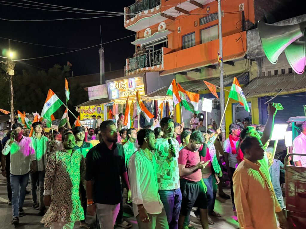 लोग हाथों में तिरंगा लिए जयकारे लगाते हुए आगे बढ़ रहे थे। तिरंगा यात्रा का नेतृत्व कर रहे पूर्व नगर पंचायत अध्यक्ष प्रमोद बरनवाल ने कहा कि पहलगाम घटना के बाद पाकिस्तान में पल रहे आतंकवादियों एवं उनके आकाओं को सबक सिखाने वाली भारतीय सेना के शौर्य व उनके सम्मान यह तिरंगा यात्रा निकाली गई है।
