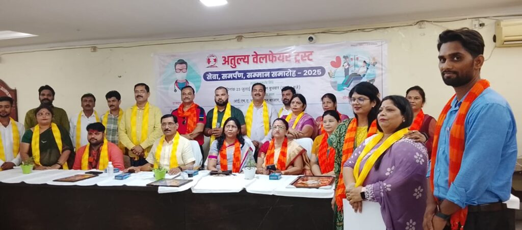 जौनपुर – अतुल्य वेल्फेयर ट्रस्ट परिवार के तरफ से  सेवा समर्पण सम्मान समारोह का आयोजन नगर के आई एम ए भवन ब्लड बैंक मे आयोजित किया गया, जिसमें ट्रस्ट परिवार के तरफ़ से शहर के   50 चिकित्सक और 20 ब्लड डोनर  का सम्मान आई एम ए अध्यक्ष डॉ शुभा सिंह, वरिष्ठ चिकित्सक डॉ वी एस उपाध्याय, संरक्षक डॉ समर बहादुर सिंह, चौकियां धाम महंत विनय त्रिपाठी के द्वारा किया गया, कार्यक्रम का शुभारंभ मुख्य अतिथि के साथ सम्मानित चिकित्सको के द्वारा दीप प्रज्वलित के साथ किया गया!  कार्यक्रम के विषय में ट्रस्ट की अध्यक्ष उर्वशी सिँह ने कहा कि डॉक्टर कोरोंना और डेंगू जैसे महामारी के दौर में बिना अपने स्वास्थ की चिंता किए खुद संक्रमित होते हुए भी समाज में अपनी अहम भूमिका निभा रहे थे, उर्वशी सिँह ने कहा कि डॉक्टर का धर्म सिर्फ मरीज़ को ठीक करना  होता है! रामायण में एक प्रसंग आता है जब मेघनाद की वीररघातनी शक्ति से लक्ष्‌मण मूर्छित हो जाते हैं। उस समय हनुमान जी लंका जाकर वहां से सुषेन वैद्य को उठाकर लाते हैं। उस समय वैद्य के मन में एक विचार आया कि उपचार करूं या नहीं, लेकिन उन्होंने उपचार किया। यह जानते हुए कि यह दुश्मन सेना का व्यक्ति है, क्योंकि उनका धर्म मरीज को ठीक करना था। हमारी भी यही अपेक्षा है कि चिकित्सक हमेशा इस भाव को कायम रखें।डॉ वी एस उपाध्याय ने कहा कि ट्रस्ट द्वारा समय समय पर बहुत ही बेहतर और उत्कृष्ट कार्य किया जा रहा है जो बहुत ही सराहनीय कार्य है! डॉ शुभा सिंह ने कहा कि अतुल्य वेल्फेयर ट्रस्ट परिवार के द्वारा निरंतर समाज में अच्छा कार्य करने के साथ लोगों की मदद करके मिशाल कायम कर रहीं हैं, संस्था को जरूरत पड़ने पर पूरा चिकित्सको के द्वारा सहयोग दिया जाएगा, कार्यक्रम की अध्यक्षता डॉ अंजू कन्नौजिया ने किया!