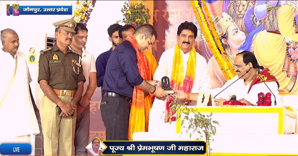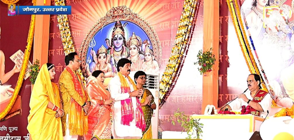 जौनपुर। बीआरपी इण्टर कॉलेज के मैदान में भाजपा के वरिष्ठ नेता एवं समाजसेवी ज्ञान प्रकाश सिंह के पावन संकल्प से प्रायोजित सात दिवसीय रामकथा के पाँचवें दिन कथा शुरू होने से पहले मुख्य यजमान ज्ञान प्रकाश सिंह ने सपरिवार व्यासपीठ का पूजन किया और भगवान की आरती उतारी।