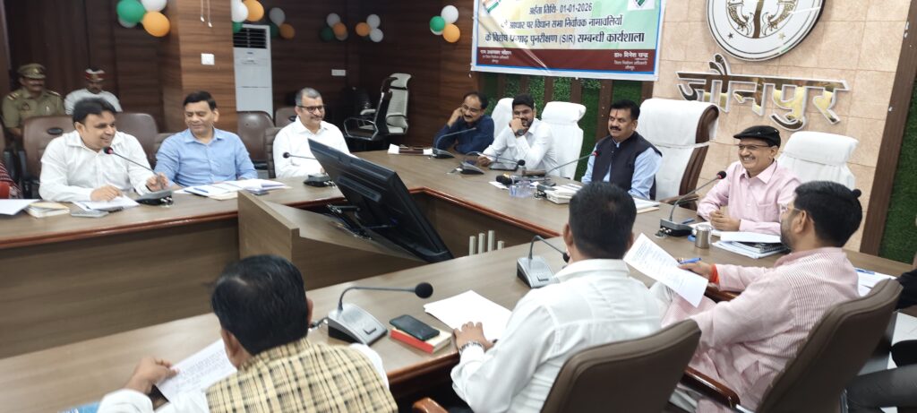 जौनपुर —- जिला निर्वाचन अधिकारी डॉ0 दिनेश चंद्र की अध्यक्षता में कलेक्ट्रेट सभागार में 29 अक्टूबर 2025 को विशेष प्रगाढ़ पुनरीक्षण (Special Intensive Revision) के सम्बन्ध में भाजपा जिलाध्यक्ष द्वय श्री पुष्पराज सिंह, श्री अजय कुमार सिंह, सचिव भाजपा श्री विनीत कुमार शुक्ला, जिलाध्यक्ष सपा राकेश मौर्य, जिला उपाध्यक्ष सपा हीरालाल विश्वकर्मा, बहुजन समाज पार्टी से चंद्रेज भारती, विनय राव, नगर अध्यक्ष कांग्रेस अली अंसारी, आम आदमी पार्टी से जफर मसूद, अपना दल (एस) से जय प्रकाश पटेल, सीपीआई (एम) से विजय प्रताप सिंह सहित अन्य प्रतिनिधियगण के साथ बैठक संपन्न हुई।